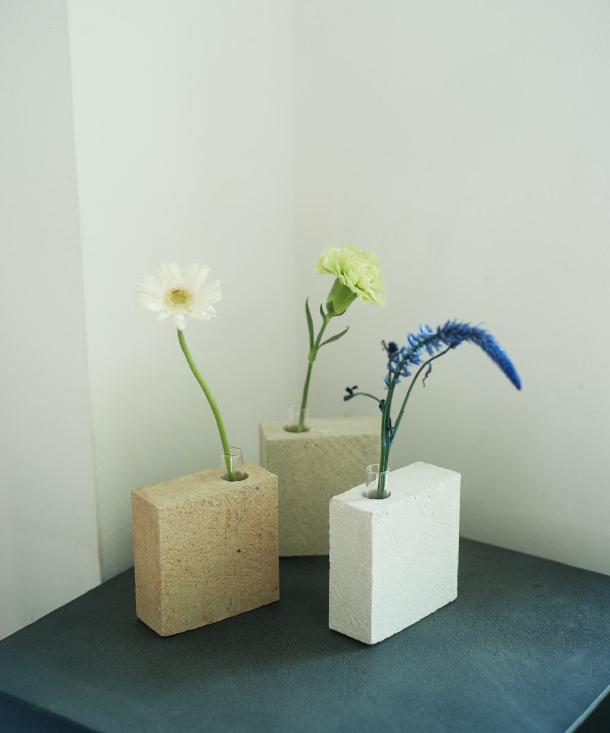 Clay Flower Vaseは、四角く成形した土にガラスの試験管を合わせたフラワーベースです。表面の加工は人の手でひとつひとつ作られ、ミニマルなデザインの中にも温もりが感じられます。